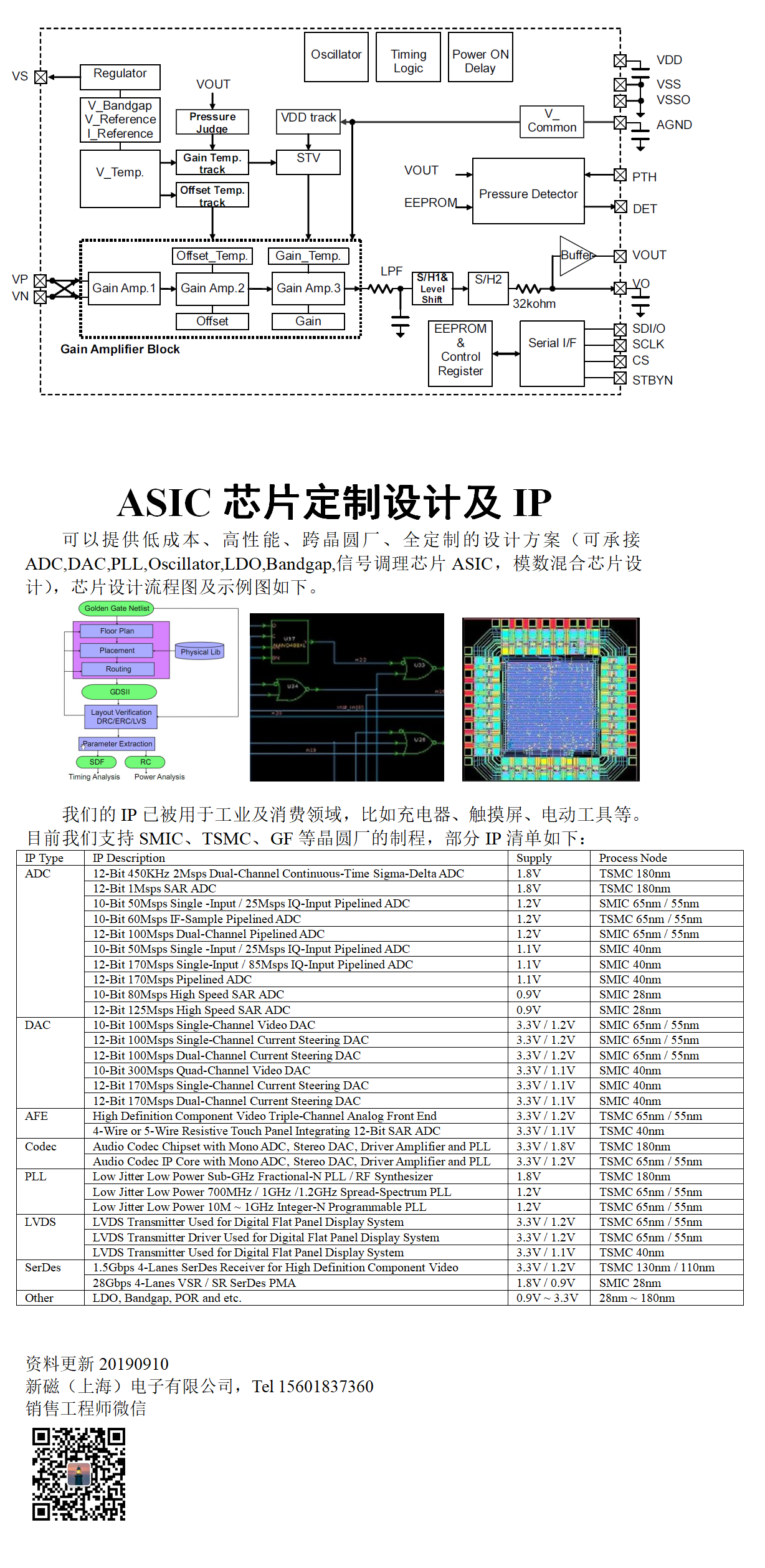 2.提供低成本、高性能、跨晶圆厂、全定制的设计方案(可承接ADC,DAC,PLL,Oscillator,LDO,Bandgap,信号调理芯片ASIC,模数混合芯片设计),芯片设计流程图及示例图如下。我们的IP已被用于工业及消费领域,比如充电器、触摸屏、电动工具等。目前我们支持SMIC、TSMC、GF等晶圆厂的制程. |